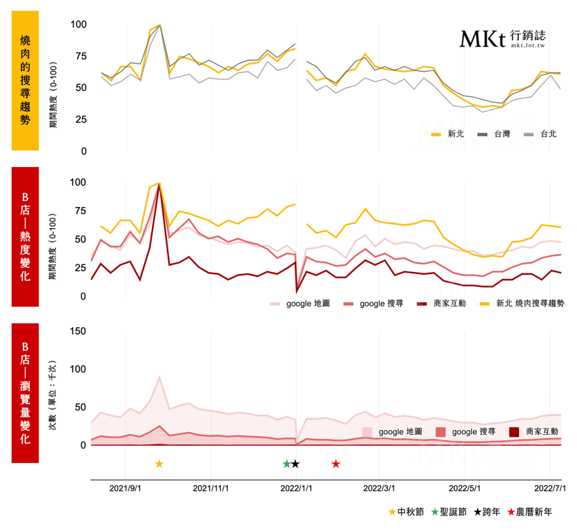 - 同時對照AB兩店的熱度變化圖,商家互動的趨勢和新北市搜尋「燒肉」的搜尋趨勢的走勢相符程度比起Google地圖、Google搜尋都來得高,以經驗判斷其實很合理,因為「透過搜尋曝光」比較是行銷漏斗的上層,而互動則是更精準的需求呈現。以經驗來說,互動次數和營業額的相關性也比較高。